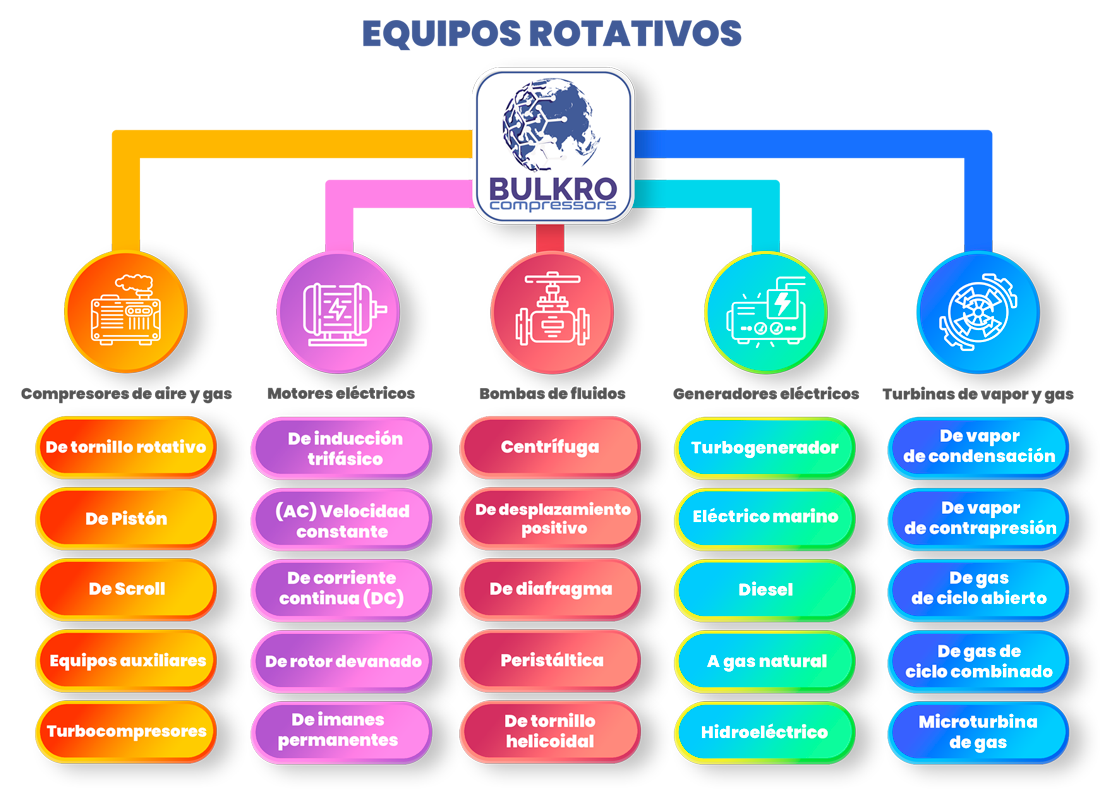 En BULKRO SSL, nos especializamos en la selección, instalación y mantenimiento integral de EQUIPOS ROTATIVOS INDUSTRIALES, fundamentales para procesos productivos eficientes y seguros. Con soluciones adaptadas a las condiciones exigentes de la industria, garantizamos la continuidad operativa de nuestros clientes en sectores como energía, petroquímica, manufactura, salud e infraestructura.