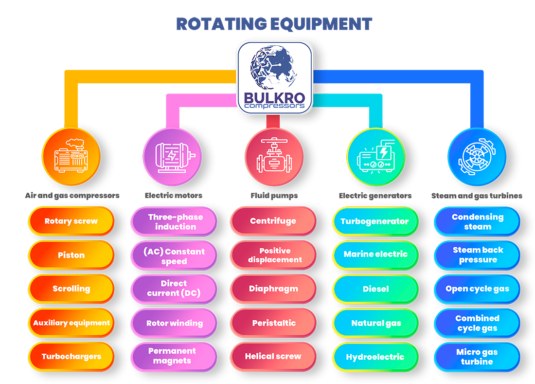 At BULKRO SSL, we specialize in the selection, installation and comprehensive maintenance of INDUSTRIAL ROTATING EQUIPMENT, essential for efficient and safe production processes. With solutions adapted to the demanding conditions of the industry, we guarantee the operational continuity of our customers in sectors such as energy, petrochemical, manufacturing, health and infrastructure.